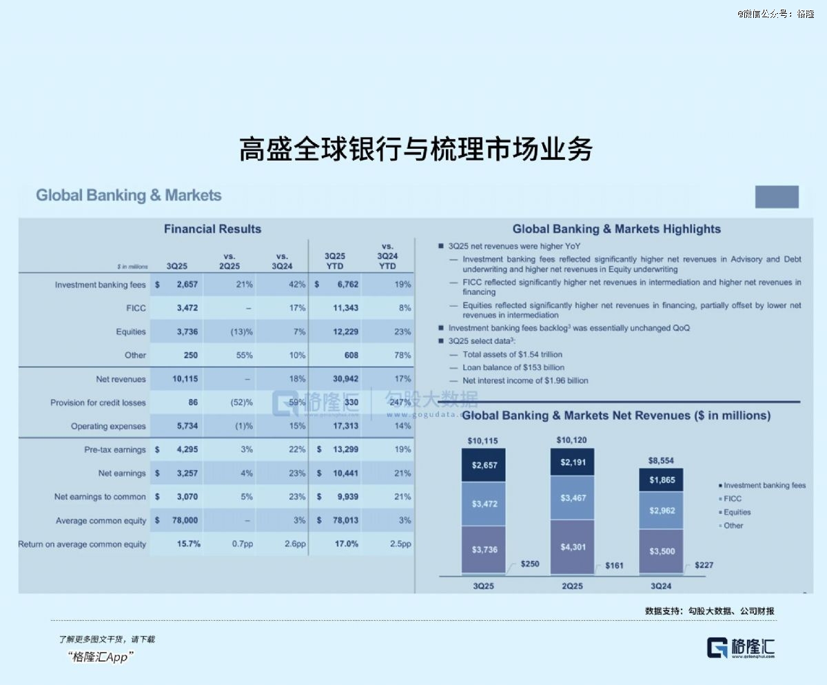 全球银行与市场业务(GBM)是高盛的核心支柱,2025年前三季度贡献69%的营收,其细分业务均具备较强竞争力:
