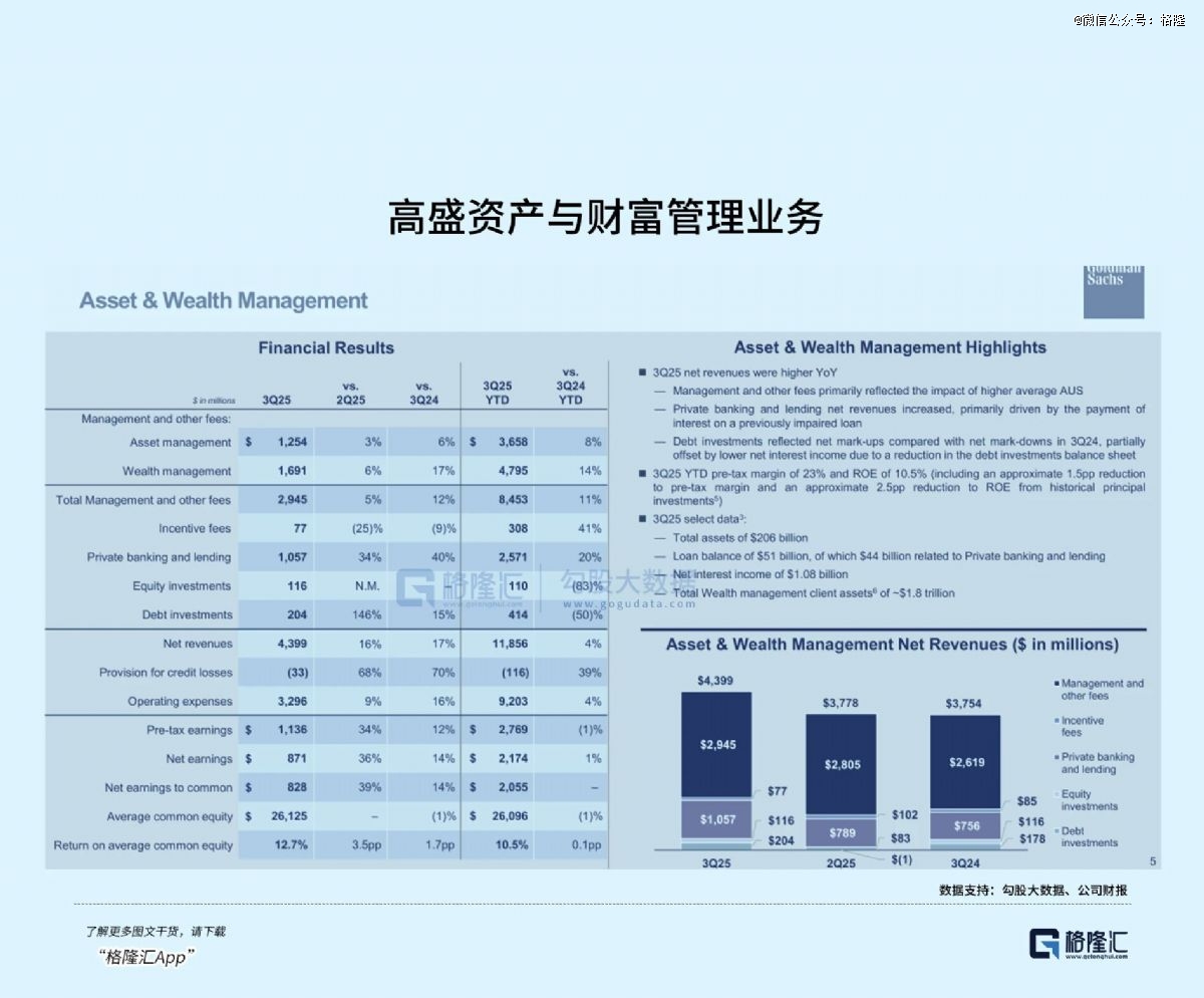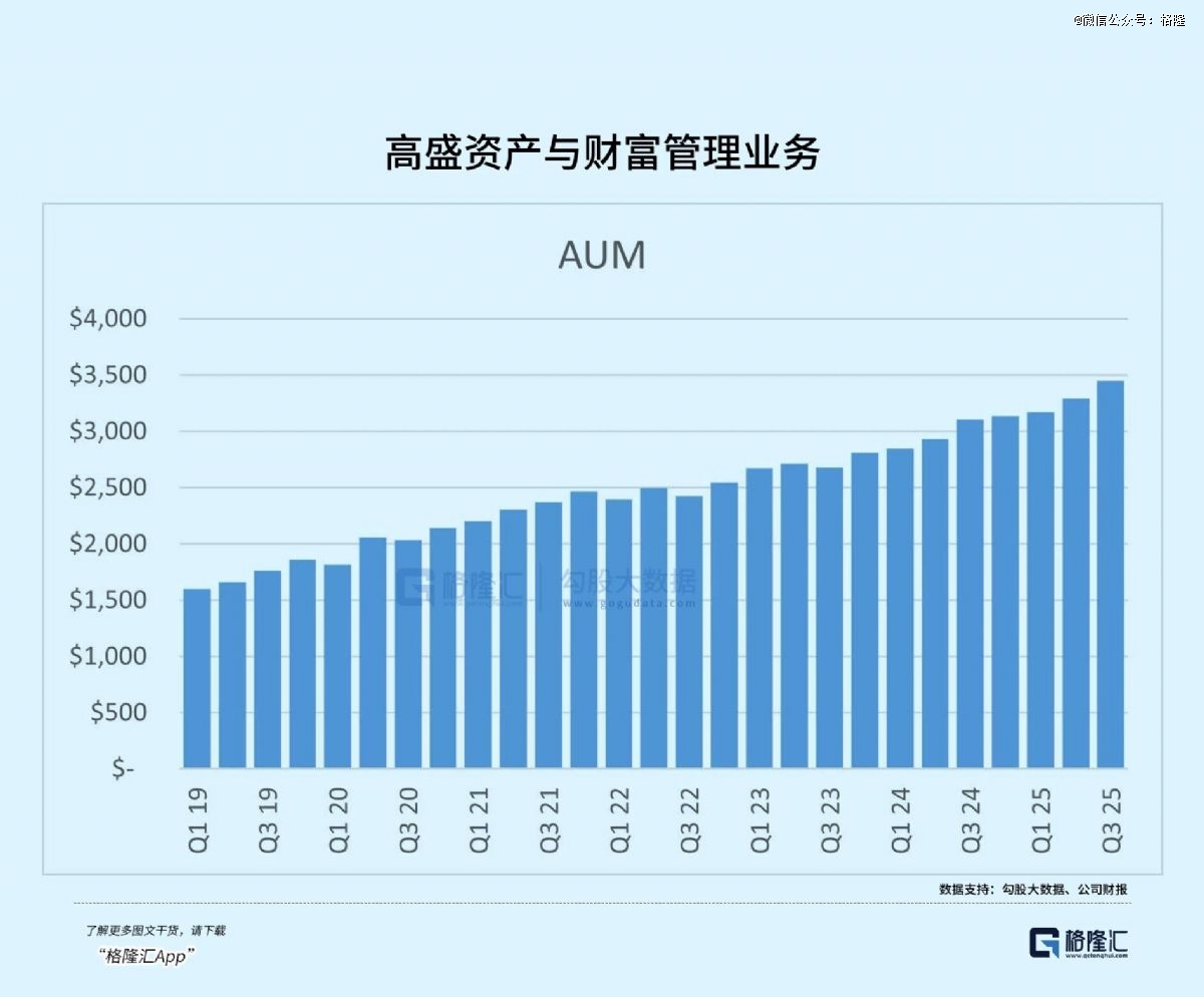资产与财富管理业务(AWM)是高盛转型的核心方向,凭借全球高净值客户资源与专业的资产管理能力,业务规模持续扩大。2025Q3,公司受监管资产规模(AUS)增长1590亿美元,达创纪录的3.45万亿美元,管理费用收入29.45亿美元,同比增长12.4%;财富管理客户资产规模达1.8万亿美元,私人银行与贷款业务净收入同比增长34%。