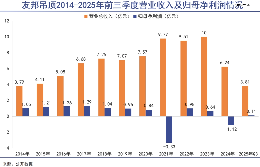 但从财报数据来看,这家行业龙头的衰退早已显现。历年财报显示,2021年友邦吊顶迎来上市后的首度亏损,全年归母净利润亏损高达3.33亿元,此后便陷入盈利波动、增收难增利的困境。2024年,友邦吊顶全年营业收入下滑至6.24亿元,营收也进入下行通道。