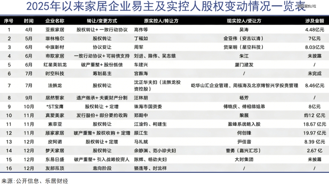 据乐居财经统计,2025年全年已有16家家居企业发生易主或控股股东股权变动,涵盖定制家居、软体、建材、家纺等多个细分领域。