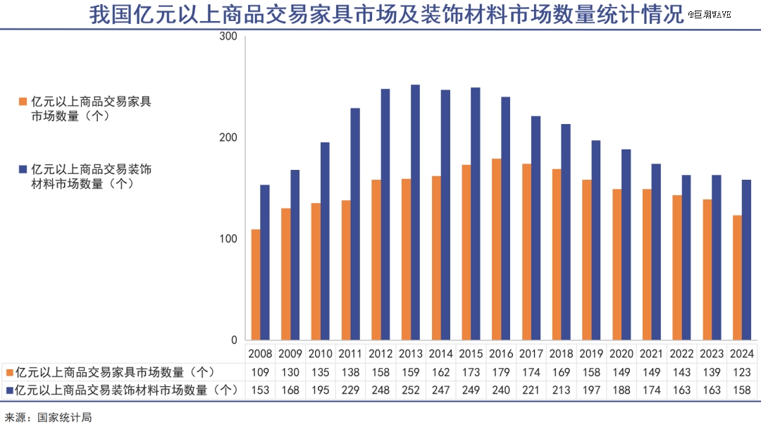 国家统计局的数据显示,我国亿元以上商品交易家具市场的数量从2016年开始下降,装饰材料市场数量从2015年开始下降,到2024年已均不及10年前水平。