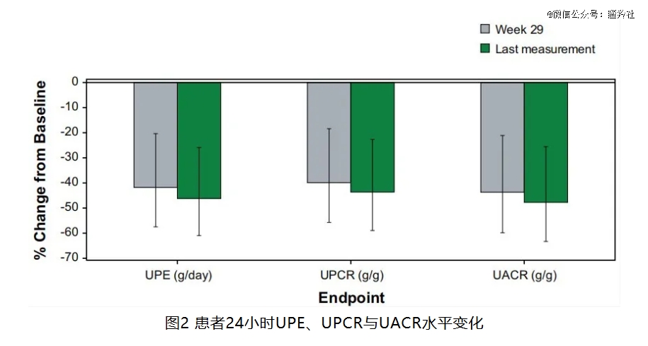 在第32周时治疗组24h-UPCR较基线下降31.4%,较安慰组下降37.4%;另外,治疗组77.2%患者观察到血尿减少,安慰剂组22.2%。