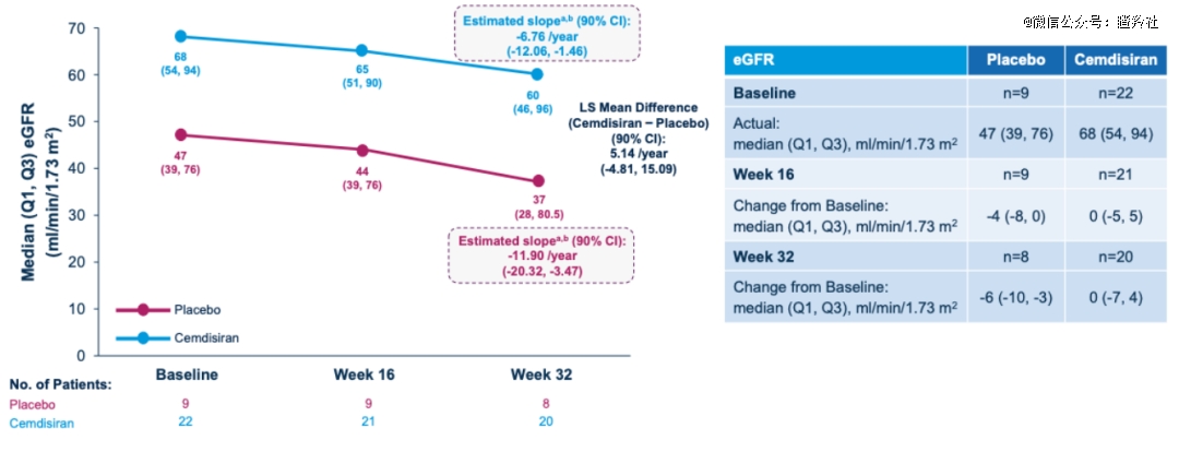 eGFR年化斜率上,治疗组-6.76 mL·min⁻¹·1.73 m⁻²,安慰剂-11.90 mL·min⁻¹·1.73 m⁻²;两组LS均值差5.14/年,这接受提示接受Cemdisiran治疗的患者肾功能下降趋势更缓但仍需进一步验证。