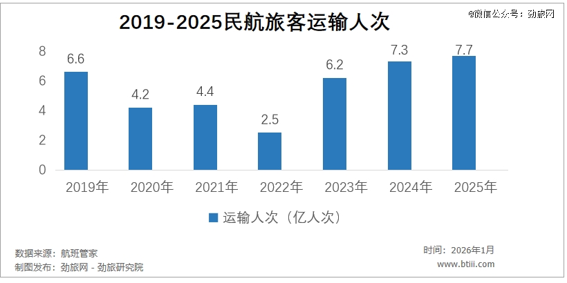 来自航班管家的统计显示,2025年我国民航完成旅客运输7.7亿人次,同比2024年增长5.5%,同比2019年增长16.7%,旅客运输创历年新高。