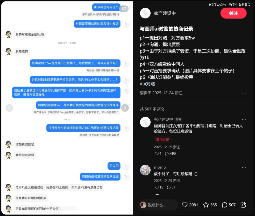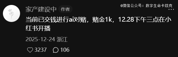 事情要从我前段时间在小红书刷到的一条AI对赌帖说起。