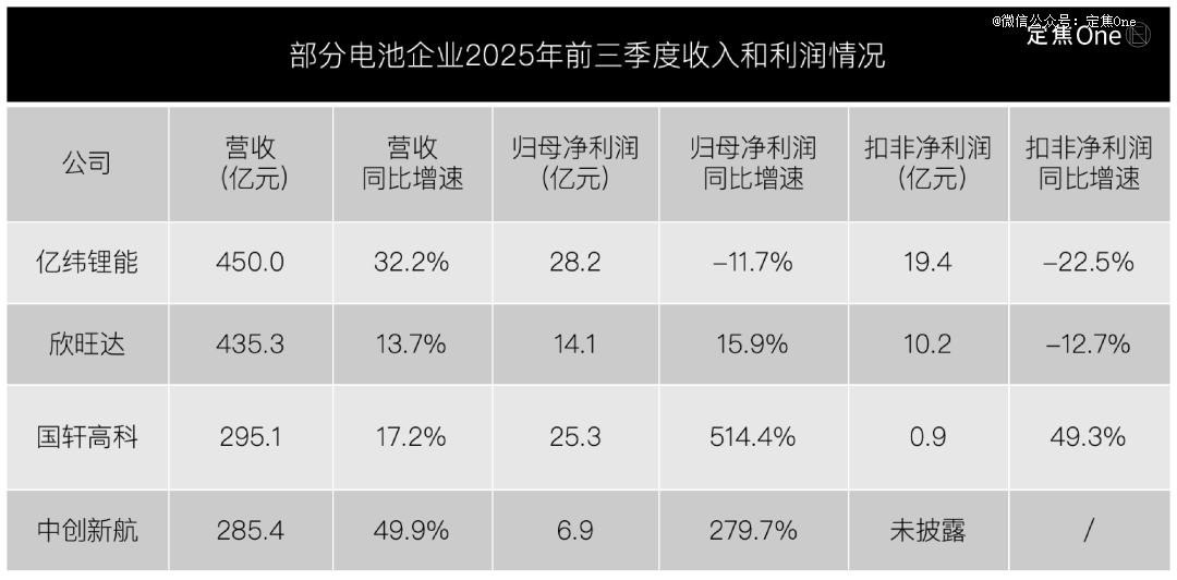 以2025年前三季度为例,被视为二线玩家中“优等生”的亿纬锂能,营收高速增长,扣非净利润却下跌超22%;国轩高科表面利润暴涨,但扣除投资奇瑞汽车的股权收益后,主营业务盈利不足1亿元;中创新航好不容易扭亏,但约6.9亿的利润规模,与行业龙头宁德时代相比有70多倍的差距。