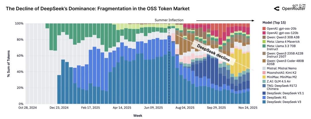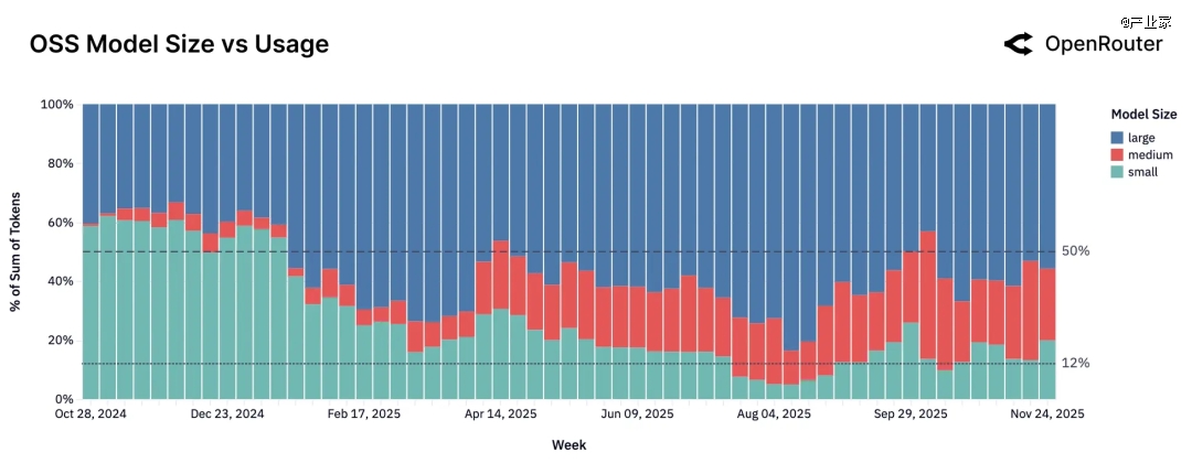 如果只看开源模型内部份额,可以看到明显的“多极化”趋势:2024 年底,DeepSeek V3 + R1 在开源流量里几乎是霸榜状态;但随着 Qwen 3 系列、Kimi K2、GPT-OSS 等新选手不断加入,到 2025 年底,没有任何一个开源模型再能拿到超过 25% 的开源 token;Top 5–7 个模型的份额差距在缩小,大家一起瓜分市场。