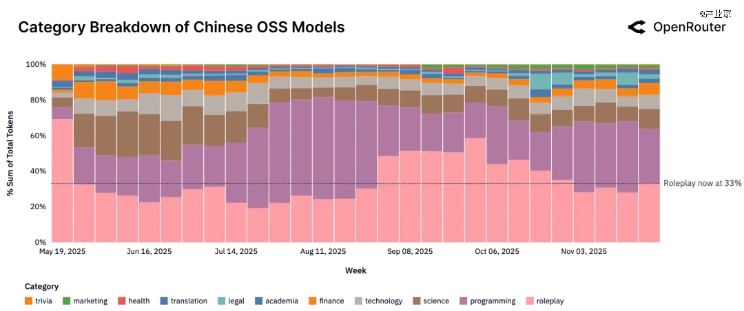 如果单独抽出“中国开源模型”来看,结构又有些不同。角色扮演仍然是最 大的类别,占比约33%,但编程和技术领域的使用量合计已占多数,达到39%。