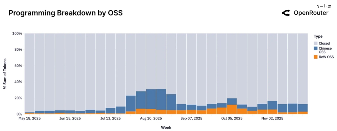 进一步,如果只看“编程”这一种任务,格局又有所不同。闭源模型整体上依然承担了大部分编程流量,尤其是 Anthropic 的 Claude 系列,一直是代码类任务中的头号选手;在开源阵营内部,2025 年中期,中国开源模型一度在编程流量上占绝 对优势(比如 Qwen Coder 系列);到 2025 年底,欧美开源(LLaMA Code、GPT-OSS 等)追上甚至在部分时间段反超。