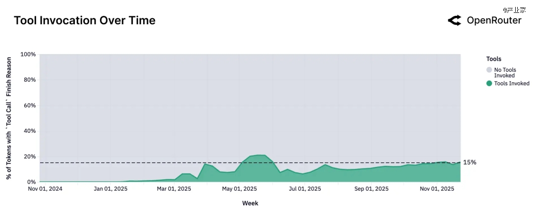 工具调用(tool-calling)是另一条清晰的上升曲线。论文通过“finish reason = tool_call”的比例来估算工具调用的使用程度,结果显示工具调用的占比在一年之内稳步提升,只有在某些大客户短期爆量时出现尖峰。