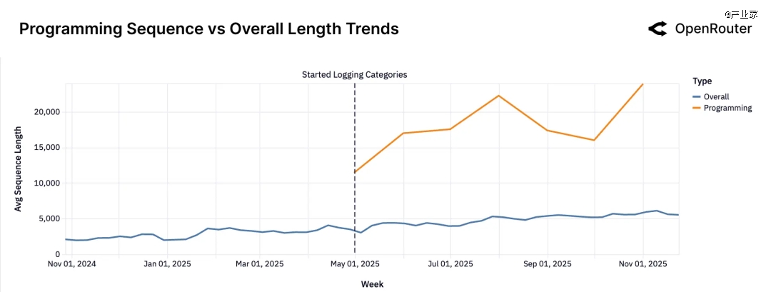 在所有类别中,编程(Programming)的增长最为夸张,2025 年初,编程相关请求大约只占所有 token 的 1 成出头;到 2025 年末,编程类任务已经吃掉了超过一半的 token。