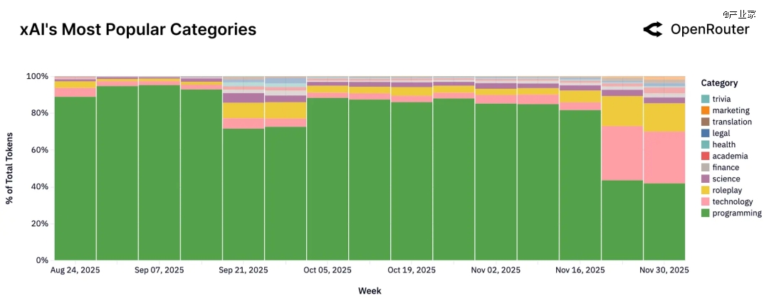 三是xAI(Grok),这类早期几乎所有流量都集中在编程;直到开放免费后,才逐渐在 roleplay、学术问答等方向扩展;展现出从“硬核工程工具”向“通用助手”扩张的轨迹。
