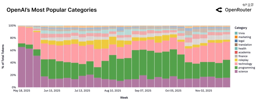 四是OpenAI,一开始,科学类问题占了很大比例(尤其是和 Machine Learning & AI 相关);随着新模型推出,编程 + 技术任务比例持续提高,年末已经超过一半;Roleplay 和日常聊天类请求占比显著下降,整体使用呈现“专业化”趋势。