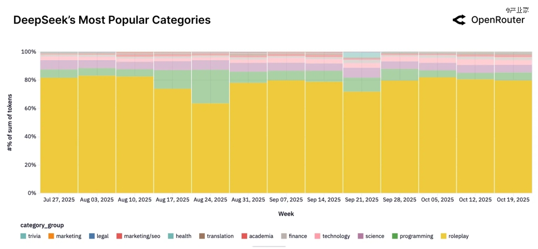 还有就是以DeepSeek、Qwen为代表的中国厂商。DeepSeek更加偏向 roleplay 和轻量聊天,编程与科学比例相对较低,但有缓慢抬头;Qwen恰好相反,40–60% 的 token 用在编程上,roleplay 和 science 的占比随时间波动。