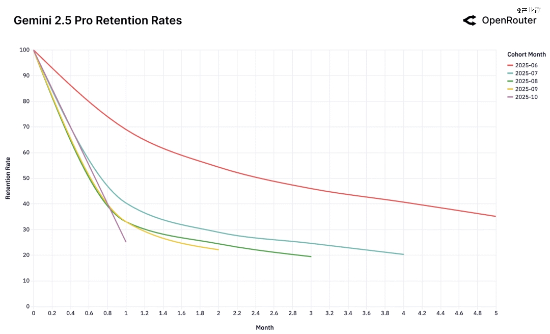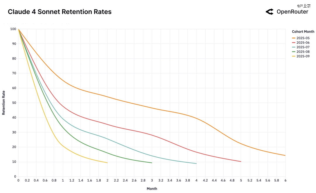 比如,Gemini 2.5 Pro 的 2025 年 6 月 cohort、Claude 4 Sonnet 的 2025 年 5 月 cohort,都展现出这种“高而稳定”的留存特征。