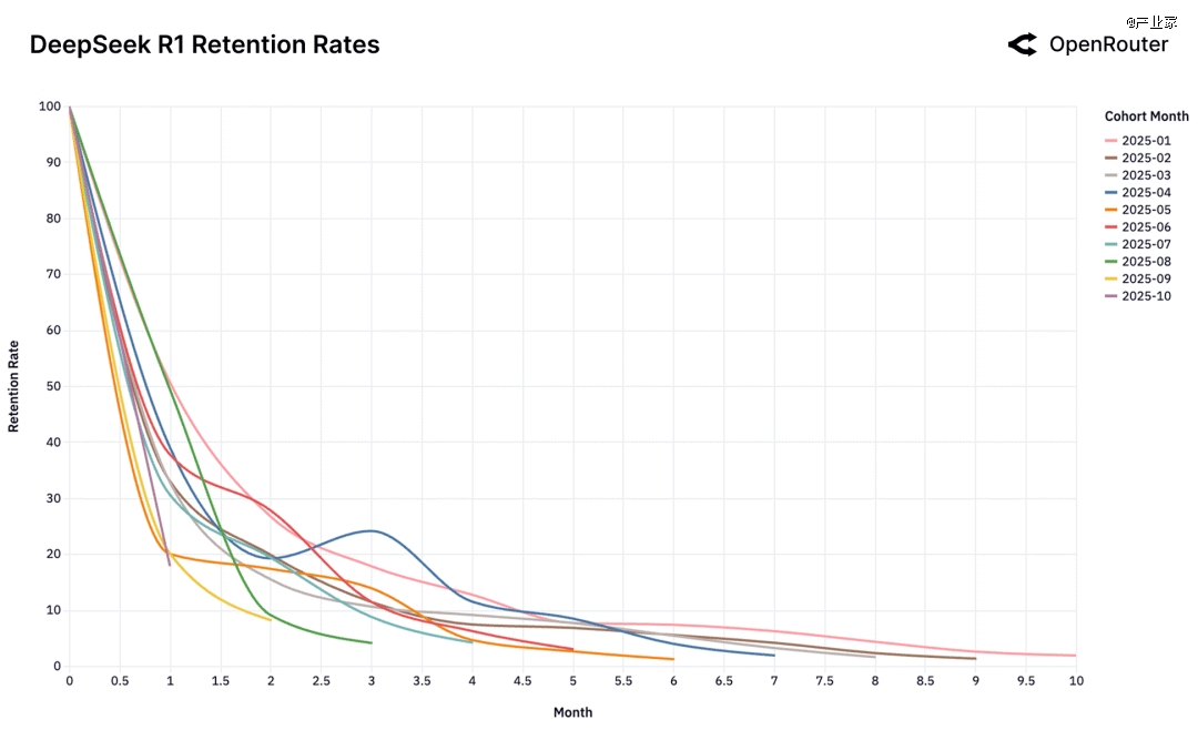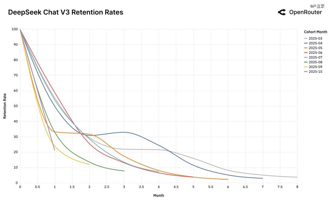 在 DeepSeek 的留存曲线里,还出现了少见的“boomerang(回旋镖)效应”,即某些 cohort 在一开始几个月快速流失;但过了一段时间后,留存曲线又出现回升,说明原本流失的用户又回来用这款模型。