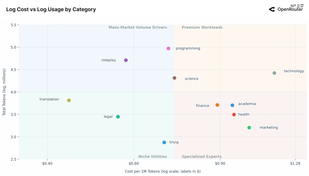 把不同任务类别画在“每百万 token 成本(横轴,log)”和“总使用量(纵轴,log)”上,可以大致分成四类。