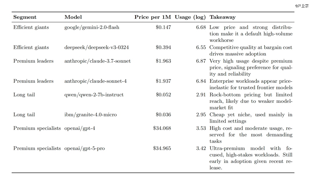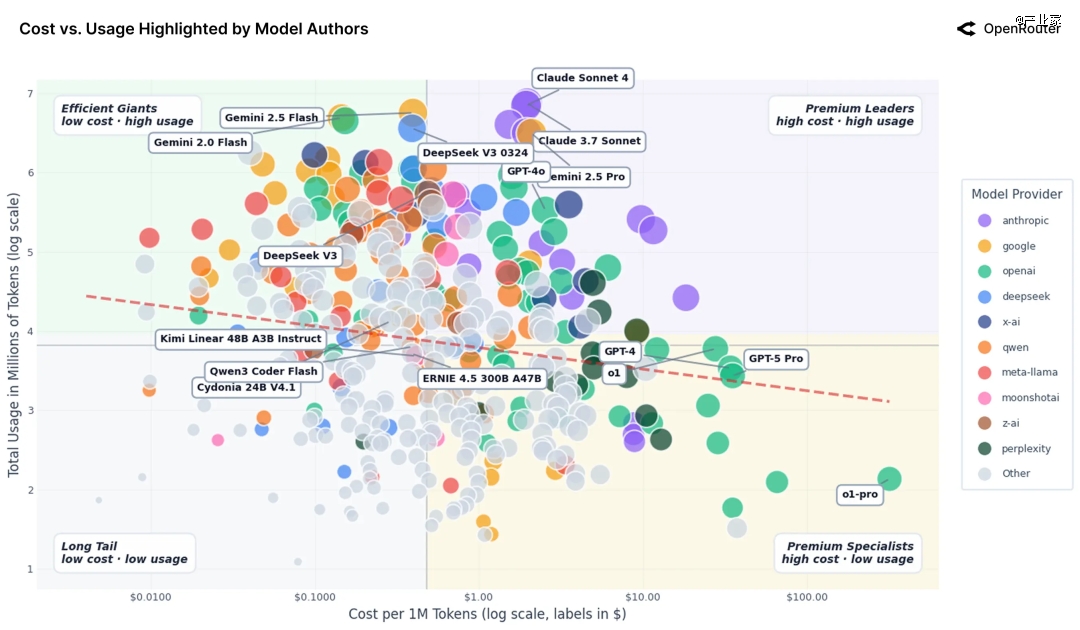 同时也能看到某些很贵的模型使用量一般,却深度服务极少数关键任务,它们的价值不能简单用“token 数”来衡量;大量“便宜但一般”的模型,没有形成工作负载–模型的强匹配,即使价格压得很低,也不会自然跑出使用量。