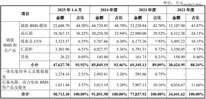 具体来看,2022年至2025年上半年(简称“报告期”),高特电子的储能BMS相关产品的营收占比在90%左右,占比较大;一体化集控单元及数据服务,以及后备电源、动力电池BMS等产品及服务的营收占比较低。