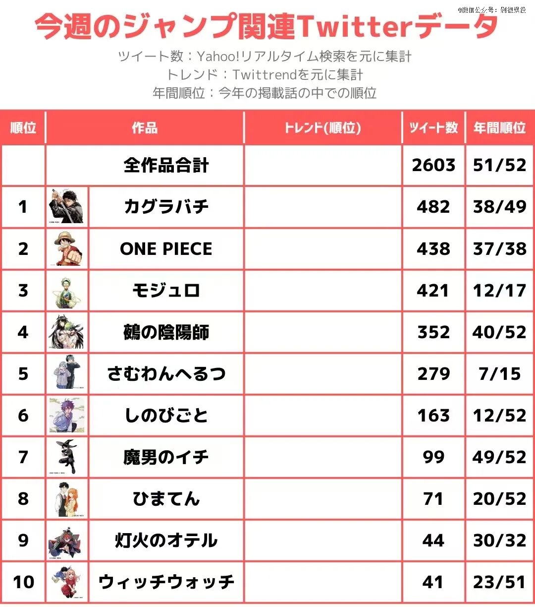 以日本业界巨头《少年周刊JUMP》为例,代表性作品断档的问题已经持续多年。一度被视为新生代台柱的《咒术回战》和《我推的孩子》也都已经在24年以欠佳的风评完结。在12月22日的JUMP相关推特趋势榜单中,除了不定期休刊的《海贼王》,几乎没有能在引进内地后还具有一定热度的作品。