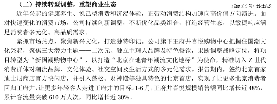 北京王府井集团的半年报将喜悦购物中心作为自己的得意案例。喜悦B2层连通地铁口的20余家谷店成为了商城吸引年轻客群的流量入口:出站逛完谷店更重要的是可以去楼上聚餐,顺路逛逛服装首饰,最后回B1喝杯奶茶。
