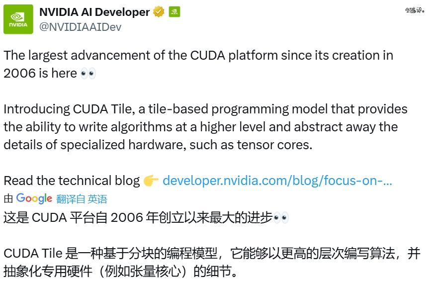 事情是这样的,上个月初英伟达毫无征兆地推出了一个叫 CUDA Tile 的 GPU 编程语言,直接让圈里人炸锅了。因为官方是这么形容这次更新的,“这是自 2006 年 CUDA 发布以来,*的一次进步”。