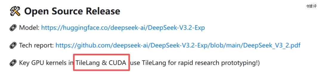 并且前段时间 DeepSeek 发布 V3.2 的时候,真的同步发布了两个版本 —— 一个 CUDA 语言构建的版本,一个 TileLang 语言构建的版本。