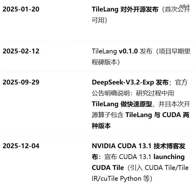 所以去年 12 月英伟达亲自下场,推出了 CUDA Tile,你可以理解为英伟达官方版本的 TileLang。