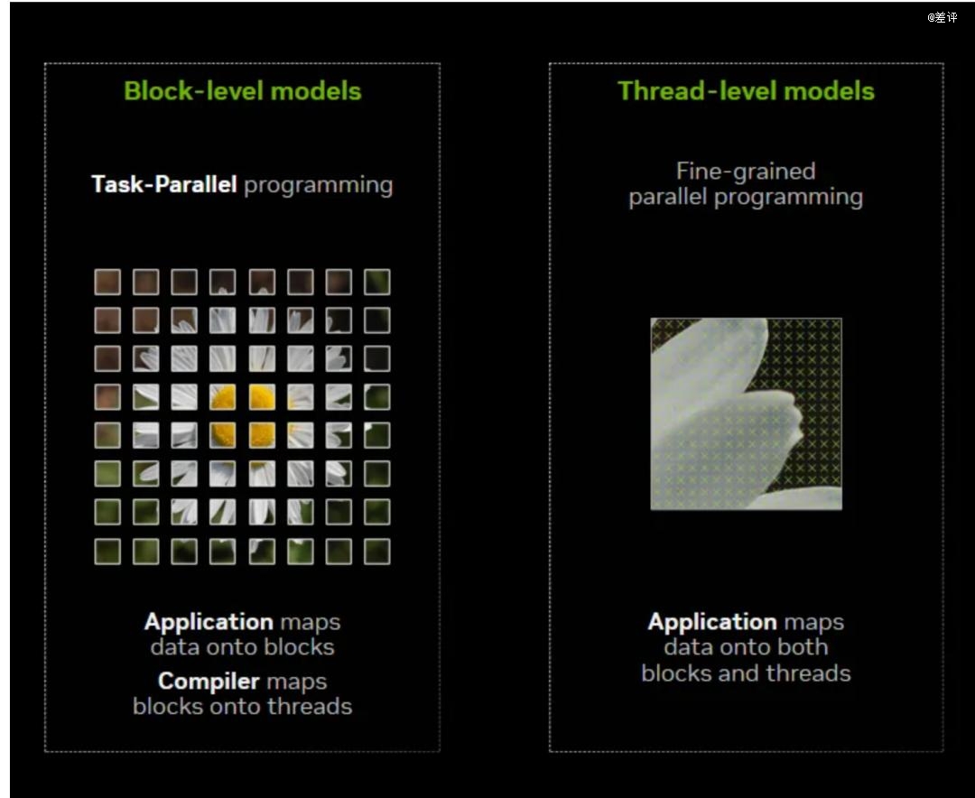 左图-从整体看任务拆分,右图-从局部看线程如何逐元素执行;CUDA 的线程思维 thread-level 属于右边这种~