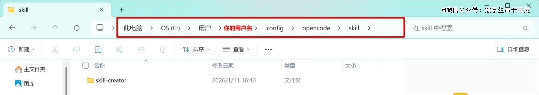 比如我的Mac电脑的路径:/Users/khazix/.config/opencode/skill