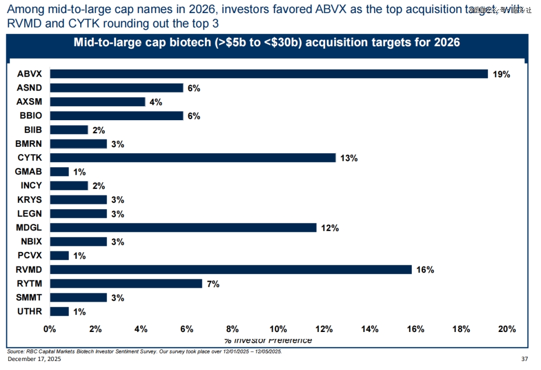 据加拿大皇 家银行调查统计,海外机构投资认为Abivax、Revolution、Cytokinetics、Madrigal是前4大可能被收购的中大型对象。
