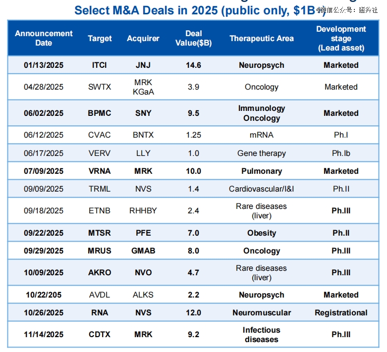 2023年JPM大会上AZ宣布收购18亿美元收购CinCor Pharma、Chiesi宣布14.8亿美元收购Amryt Pharma,2024年JPM大会强生20亿美元收购Ambrx Biopharma、GSK以14亿美元收购Aiolos Bio。时间来到2025年JPM大会,强生146亿美元收购Intra-Cellular Therapies、礼来以25亿美元收购Scorpion Therapeutics的PI3Kα管线,可以看到单笔交易金额正在进一步放大。