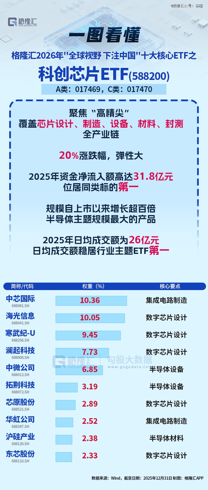 在2026年格隆汇“下注中国”十大核心ETF中,作为半导体主题规模最 大的产品,wind数据显示,截至2026年1月9日,科创芯片ETF(588200)上市迄今回报达到154.35%,年化收益达34.88%。