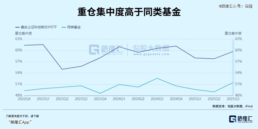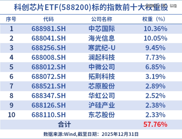 前十大重仓股权重合计占比高达57%,囊括了中芯国际(晶圆代工龙头)、海光信息(国产CPU领军者)、寒武纪(AI算力芯片先锋)、中微公司(刻蚀设备巨头)以及澜起科技(内存接口芯片龙头)等行业中流砥柱。