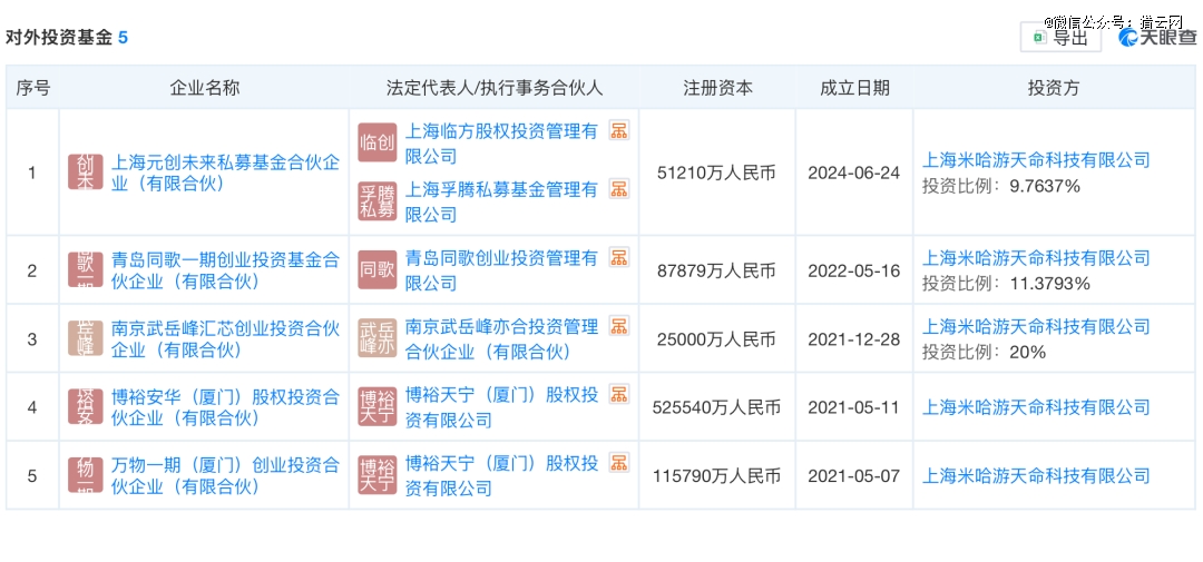 此后,米哈游又在2022年5月和2024年6月,分别参股青岛同歌一期创业投资基金合伙企业(有限合伙)和上海元创未来私募基金合伙企业(有限合伙),前者由同歌创投管理,米哈游持股11.3793%,后者由孚腾资本管理,米哈游持股9.7637%。