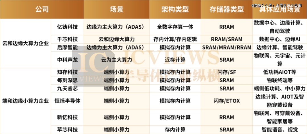 国内初创企业大都聚焦于无需考虑先进制程技术的存内计算。其中,知存科技、亿铸科技、九天睿芯等初创公司都在押注PIM、CIM等“存”与“算”更亲密的存算一体技术路线。亿铸科技、千芯科技等专注于大模型计算、自动驾驶等AI大算力场景;闪易、新忆科技、苹芯科技、知存科技等则专注于物联网、可穿戴设备、智能家居等边缘小算力场景。