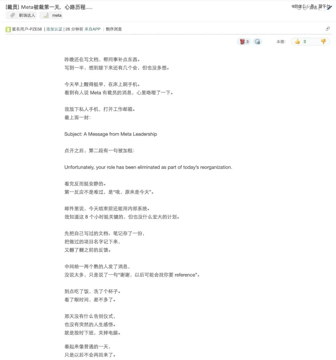 在知名海外华人社区当中,有被波及的Meta员工表示,自己是突然间就收到了裁员通知。