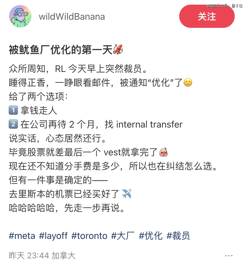 网友透露,自己一觉醒来就收到了裁员邮件,Meta给了两个选项,要么拿钱走人,要么在两个月完成内部转岗。