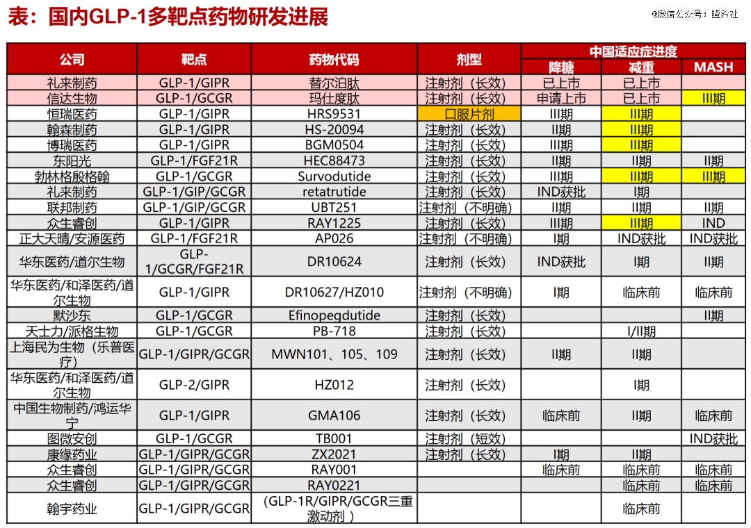 先从国内进度来看,双靶点/多靶点GLP药物中HS-20094算是仅次于礼来替尔泊肽、信达玛仕度肽的第二梯队选手,目前肥胖适应症正处于临床三期,研究已累计给药超一千名受试者,预计将在2026Q1公布数据结果。