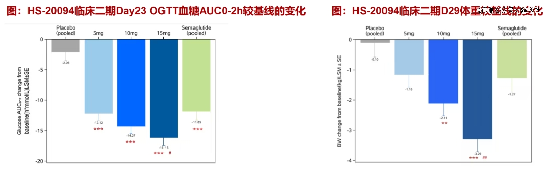 HS-20094目前最新公开数据为2024 EASD年会上的II期临床研究数据,减重适应症方面,在第4周时HS-20094的15mg组体重较基线的下降4.41%,显著优于司美格鲁肽组(3.29kgvs1.27kg,p=0.0024)。