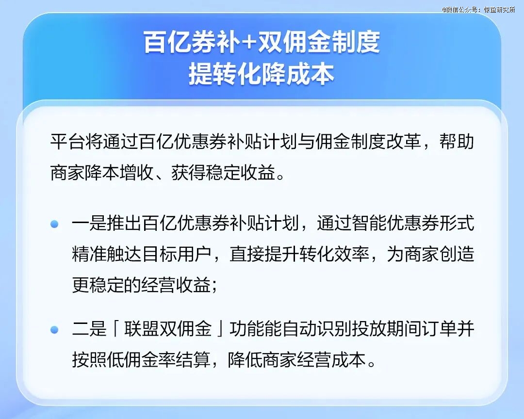 从联盟“双佣金功能”的推出可以明显看到一个趋势:平台正在借助更多技术手段帮助商家提升经营效率。而惊蛰研究所注意到,抖音电商升级后的“九大商家扶持政策”中,除了联盟“双佣金功能”,还新增了百亿智能优惠券补贴计划。通过智能优惠券帮助商家精准触达目标用户,实现转化效率的直接提升,从而带来更稳定的经营收益。
