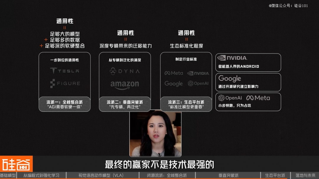 我们可以把他们分成三个流派来看,表面上看,他们争的是技术路线、市场份额、融资估值,但本质上,他们争的是同一个问题:什么才是实现“通用机器人”的正确路径?