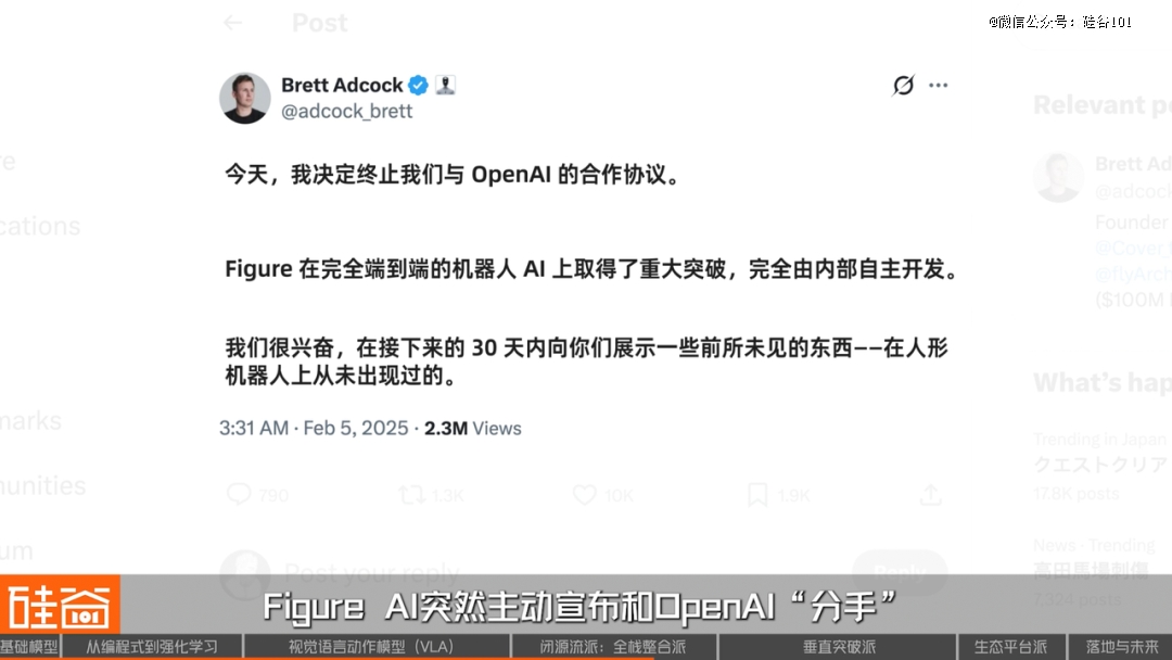 但好景不长。2025年2月,Figure AI突然主动宣布和OpenAI“分手”:他们要独立推出自己的基础模型,不再依赖OpenAI的技术。分手后的Figure AI,两周后就迅速推出新Helix模型,定位为通用人形机器人VLA模型,强调是完全自研、用于控制整个人形机器人。