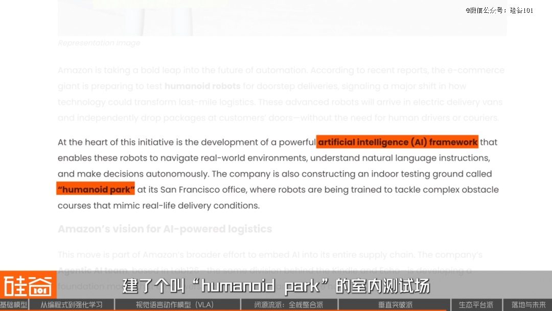 但这100万台机器人,全都是专用机器人,针对具体场景优化:Hercules能搬运1250磅货物,Pegasus用于包裹分拣、运输,但亚马逊的野心不止于此。他们的Agentic AI团队正在开发通用机器人基础模型,还在旧金山办公室建了个叫“humanoid park”的室内测试场,训练人形机器人应对复杂障碍。