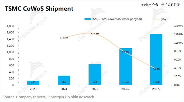 结合行业数据及市场预期,台积电当前CoWoS的月产能约7万片左右,至2026年末有望扩大至12万片左右。海豚君预估2026年台积电CoWoS的出货量有望达到110万片以上,同比增长77%,其中英伟达、AMD和博通是最主要的客户。
