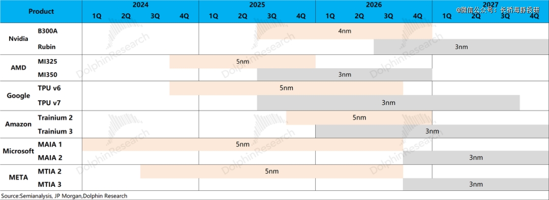 b)2nm进展及制程迁移:台积电的2nm在2026年进入大规模量产爬坡,公司会把苹果、高通等部分手机芯片的需求迁移至2nm的平台。与此同时,AI芯片也将全面升级至3nm时代,其中Rubin、MI350以及谷歌TPUv7都将使用台积电的3nm工艺进行生产。