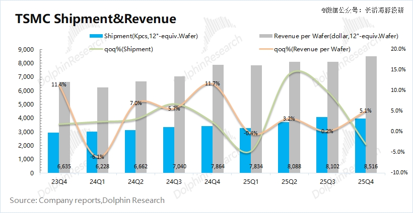 1)量的维度:2025Q4台积电的晶圆出货量3961千片,环比下滑3%,受到2nm量产初期的产能调整等因素影响。公司将2026年的资本开支目标上调至520-560亿美元,再度增加110-150亿美元。大幅提升的资本开支,是公司持续扩产的明确信号。