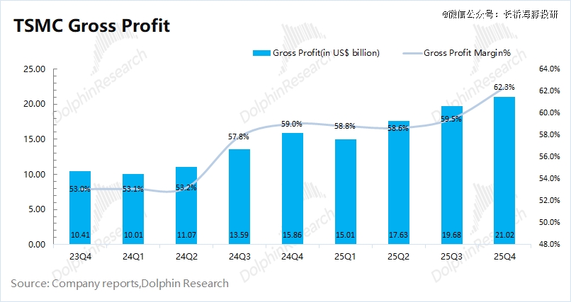 台积电在2025年第四季度实现毛利210亿美元,环比增长6.8%。其中毛利率62.3%,环比提升2.8pct,产品均价持续提升是毛利率向上的主要因素。
