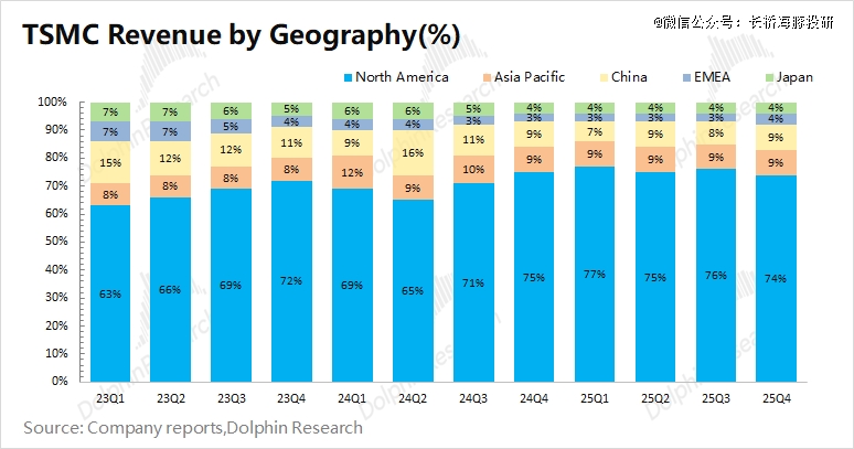 从各地区收入来看,北美地区仍是台积电最 大的收入来源,收入占比为74%。这是由于北美地区有苹果、英伟达、AMD、高通等大客户,使得台积电和美国之间有很强的商业绑定关系。