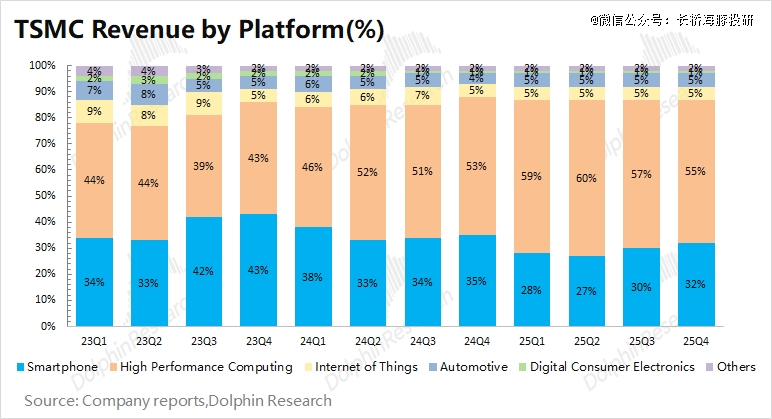 b.下游应用端:公司本季度收入环增主要来自于手机业务,因iPhone新机出货。在英伟达、博通等AI芯片需求的影响下,高性能计算依是公司最 大的收入来源,本季度达到185.5亿美元,收入占比55%。